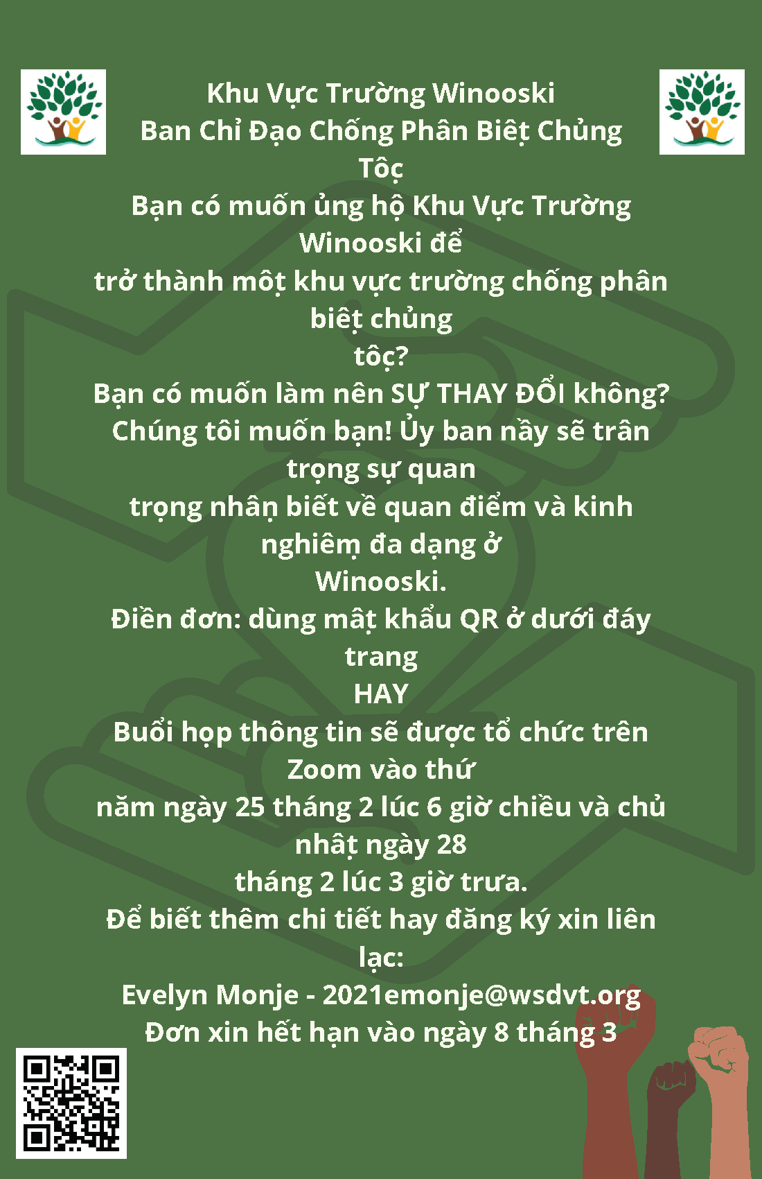 October 15, 2020 – The WSD leadership team is excited to see a strong group of WSD staff returning to this important work after allowing the Winooski Students for Antiracism (WSA) to lead these past few months. Together, we will move forward with all stakeholders actively participating in our antiracism efforts. As a reminder, here are WSA’s Demands. The school board has adopted demands #1 and 4-8.